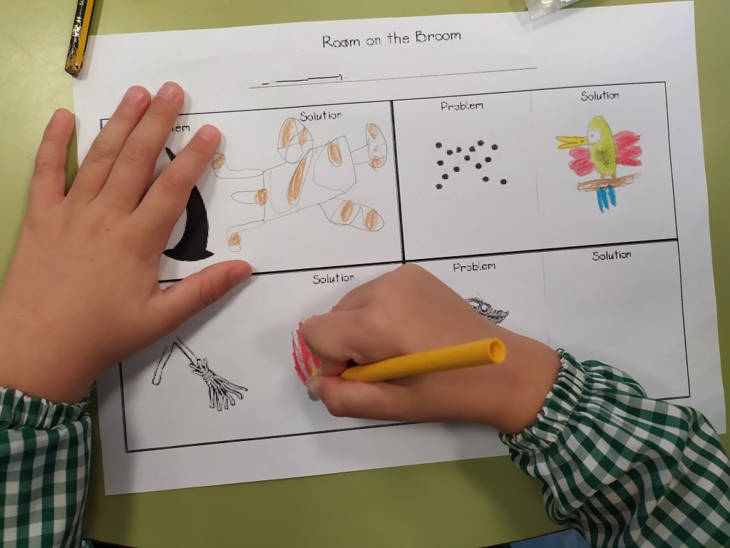 👻 Hemos contado el cuento A ROOM ON THE BROOM , escenificándolo con sus personajes. Es un cuento bastante gracioso donde una brujita pierde su sombrero, su varita… y unos animales la ayudan y le van preguntando si tienen sitio en su escoba para montarse. ¿Cabrán todos en la escoba de la brujita?