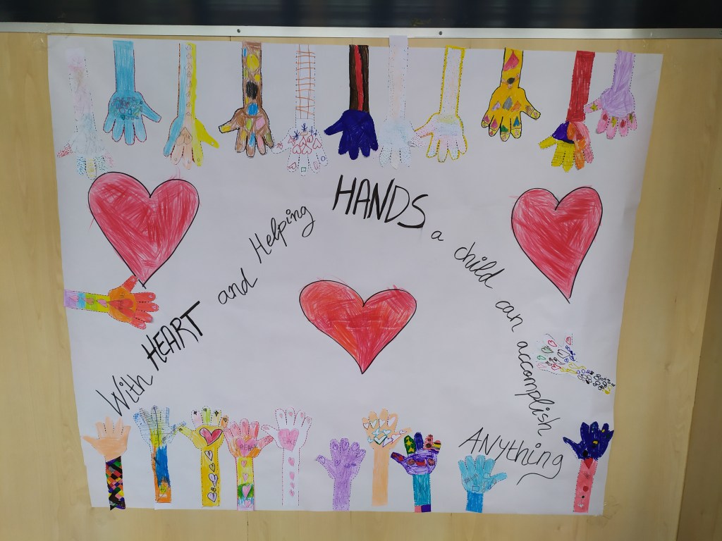 Es por ello que hemos elegido como lema WITH HEART AND HELPING HANDS A CHILD CAN ACCOMPLISH ANYTHING– lo que viene a decir que con CORAZÓN Y MANOS UN NIÑO PUEDE CON TODO. Este lema lo hemos plasmado con los niños de 5 años en un mural en grande donde hemos pintados nuestras manos de diferentes colores y formas. Este ha sido el resultado.