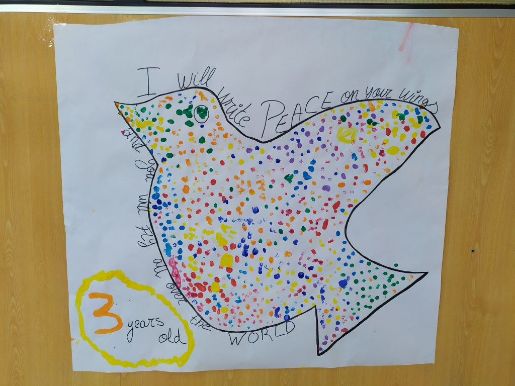Con los peques de 3 añitos hemos coloreado nuestra propia paloma de la paz con nuestros dedos y puntitos de colores. Hemos usado la frase I WILL WRITE PEACE ON YOUR WINGS AND YOU WILL FLY ALL OVER THE WORLD- Escribiré PAZ en tus alas y volarás por todo el mundo. Así nos ha quedado