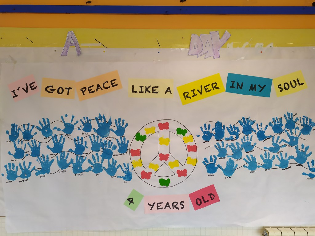 El lema de 4 años ha sido I’VE GOT PEACE LIKE A RIVER IN MY SOUL – Tengo paz como un río en mi alma, donde mi compi ha hecho este mural tan chulo..