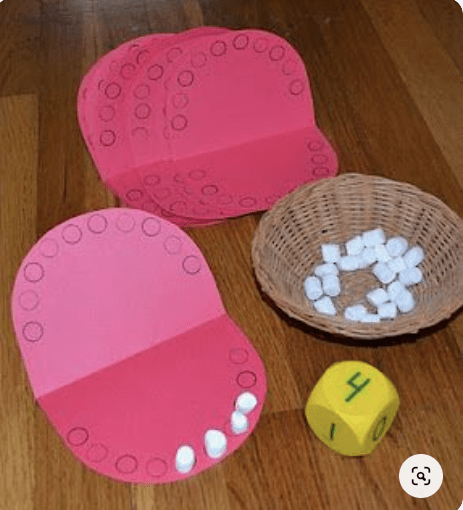 - Podemos dibujar una boca grande grande, sin dientes. Cogemos un dado y unas cuantas judías blancas o garbanzos, que harán de dientes. Tiramos el dado y tenemos que poner tantos dientes como nos diga el dado. También podemos ir escribiendo el número que nos dice el dado, ponemos los dientes, volvemos a tirar y escribimos el número otra vez, como si estuviéramos haciendo una suma. ¿Cuántos dientes tenemos ahora?