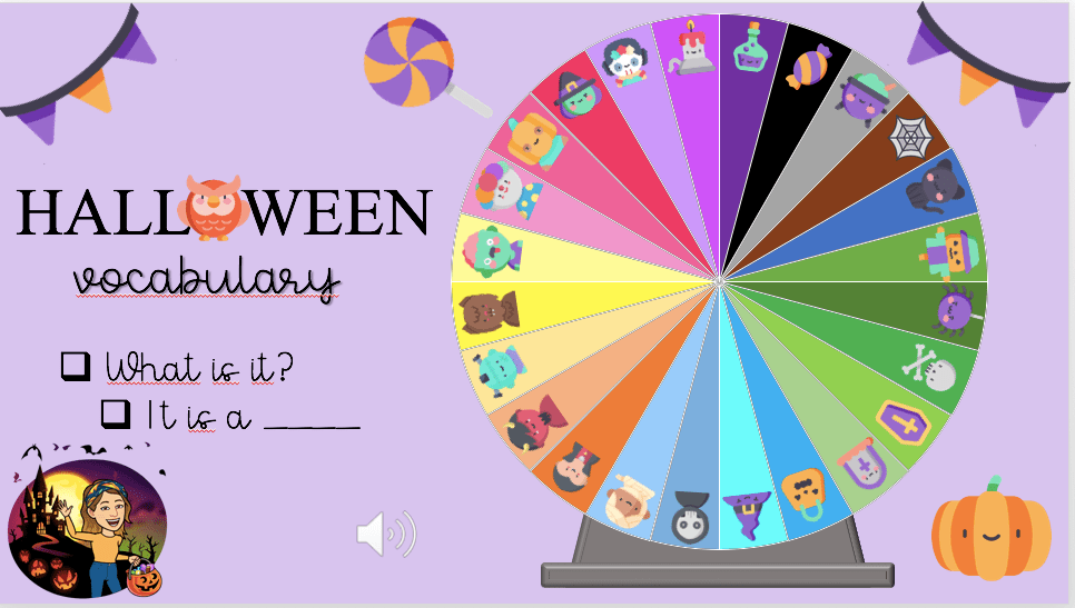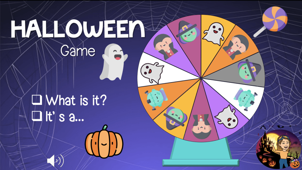 Hemos visto un vídeo y presentación de PPT sobre la historia de Halloween que os dejo aquí debajo y hemos jugado con la ruleta (@thesunnyteacher) y las pizarras a ver qué personaje nos tocaba y cómo se escribía.