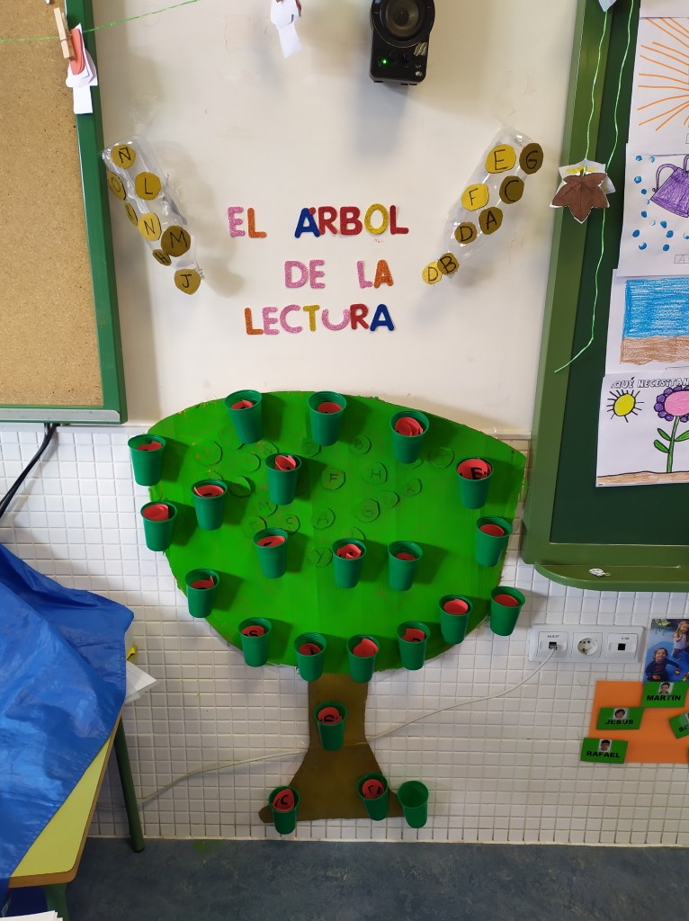 Hemos ido ambientando algunos lugares del aula, como en este caso, la zona de la Biblioteca donde hemos hecho el Árbol de las lecturas.