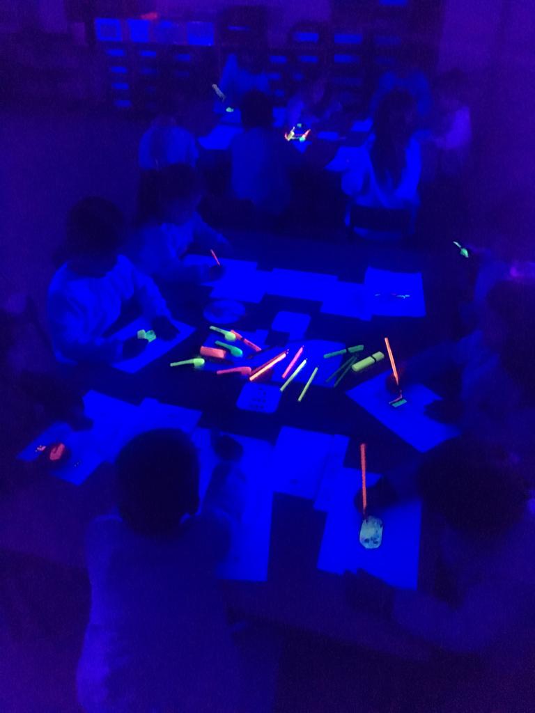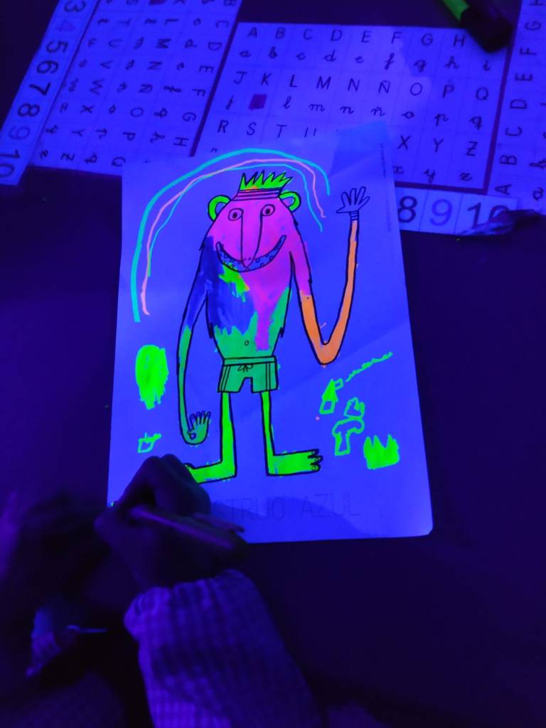Hemos realizado una sesión en la que hemos apagado las luces y nos hemos puesto manos a la obra a pintar nuestros monstruos favoritos. Hemos utilizado rotuladores fluorescentes para hacer nuestros dibujos y luego los hemos podido visualizar gracias a unas bombillas de luz negra que he podido encontrar en Amazon.